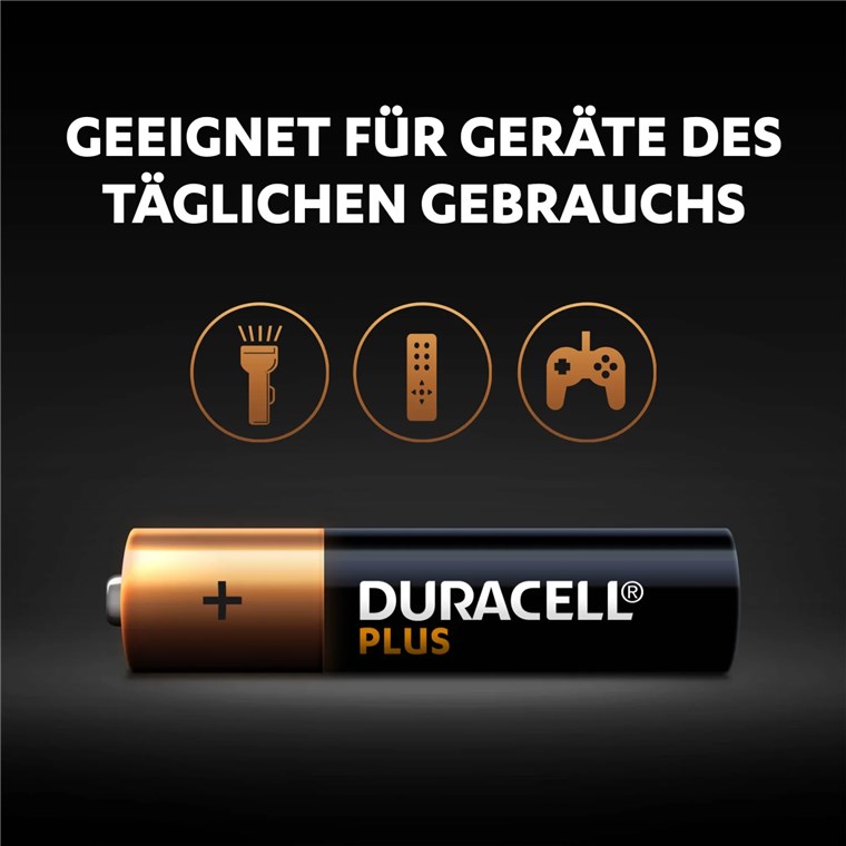 • Duracell Plus Power AAA-Batterien sind ideal für die konstante Stromversorgung von Geräten des täglichen Bedarfs geeignet.