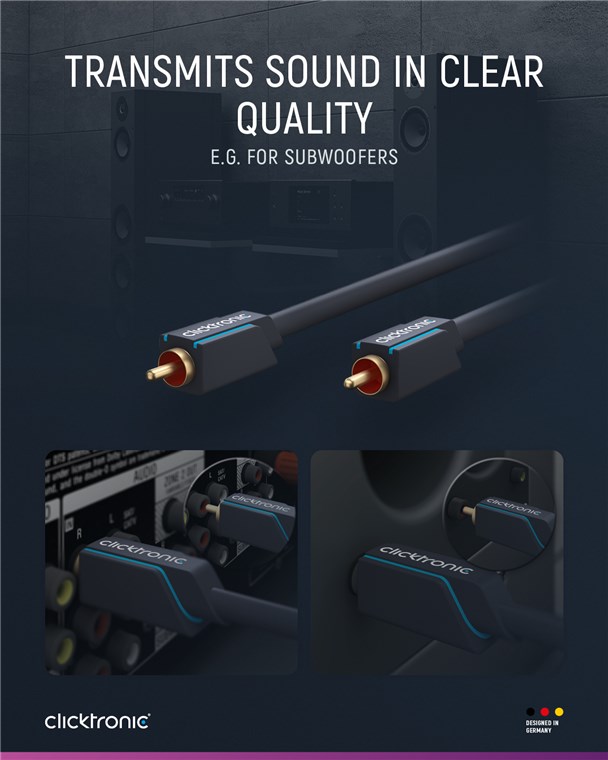 Clicktronic legt größten Wert auf Langlebigkeit und Stabilität. Unser Qualitätsversprechen: 10 Jahre Garantie auf unsere Cinchkabel. Der dreiteilige Steckeraufbau aus PVC- und ABS-Komponenten kompensiert ein ruckartiges Ziehen am Kabel, wodurch es ideal vor Kabelbrüchen geschützt ist. Hochwertige, vergoldete Kontakte und reine Kupferleiter übertragen Signale in maximaler Soundqualität für ein perfektes Klang-Erlebnis. Die markeneigene, robuste Konstruktion unserer Audiokabel sorgt somit für dauerhaftes Home-Entertainment.