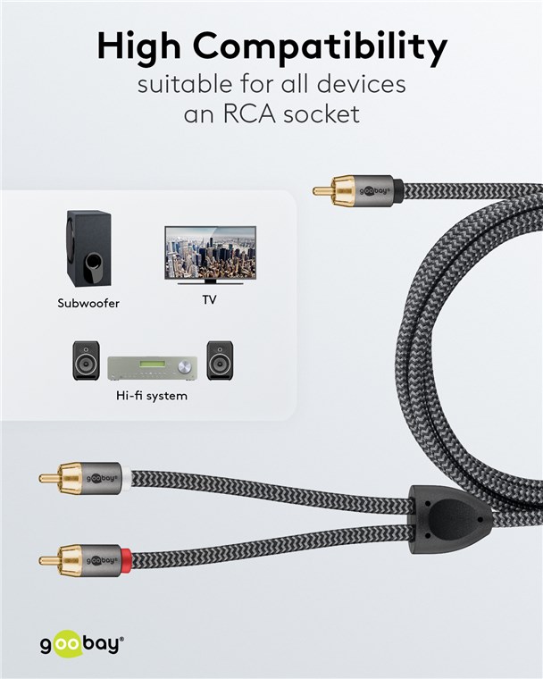 Die Goobay Plus Serie im schlanken, edlen Metalldesign in Sharkskin Grey. Das Kabel ist speziell auf die analogen Niederfrequenz-Signale von Subwoofern zugeschnitten - für die satte, druckvolle Wiedergabe von Bässen für ein beeindruckendes Musik- und Filmerlebnis.
