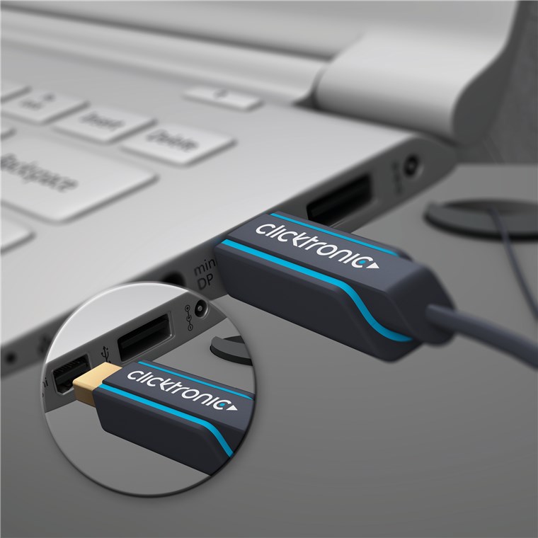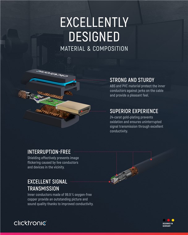 Clicktronic legt größten Wert auf Langlebigkeit und Stabilität. Unser Qualitätsversprechen: 10 Jahre Garantie auf unsere DisplayPort™-Kabel. Die markeneigene Konstruktion unserer Verbindungskabel macht sie äußerst robust. Der dreiteilige Steckeraufbau aus PVC- und ABS-Komponenten kompensiert ein ruckartiges Ziehen am Kabel, wodurch es ideal vor Kabelbrüchen geschützt ist. Hochwertige, vergoldete Kontakte und reine Kupferleiter übertragen Audio- und Video-Signale in maximaler Qualität für ein perfektes Heimkino- und Gaming-Erlebnis. Das Clicktronic-DisplayPort™-Kabel ermöglicht ein gestochen scharfes Bild und besitzt eine sehr schnelle Übertragungsgeschwindigkeit.