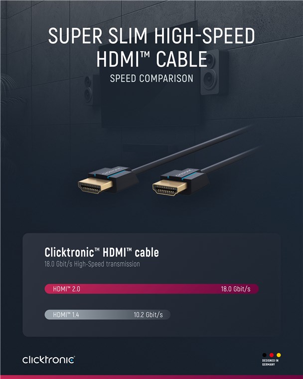 Clicktronic legt größten Wert auf Langlebigkeit und Stabilität. Unser Qualitätsversprechen: 10 Jahre Garantie auf unsere HDMI™-Kabel. Die markeneigene Konstruktion unserer Verbindungskabel macht sie äußerst robust. Der dreiteilige Steckeraufbau aus PVC- und ABS-Komponenten kompensiert ein ruckartiges Ziehen am Kabel, wodurch es ideal vor Kabelbrüchen geschützt ist. Hochwertige, vergoldete Kontakte und reine Kupferleiter übertragen Audio- und Video-Signale in maximaler Qualität für ein perfektes Heimkino- und Gaming-Erlebnis. Das Clicktronic-Ultra-Slim HDMI™-High-Speed-Kabel ermöglicht ein gestochen scharfes Bild und besitzt eine extrem schnelle Übertragungsgeschwindigkeit.