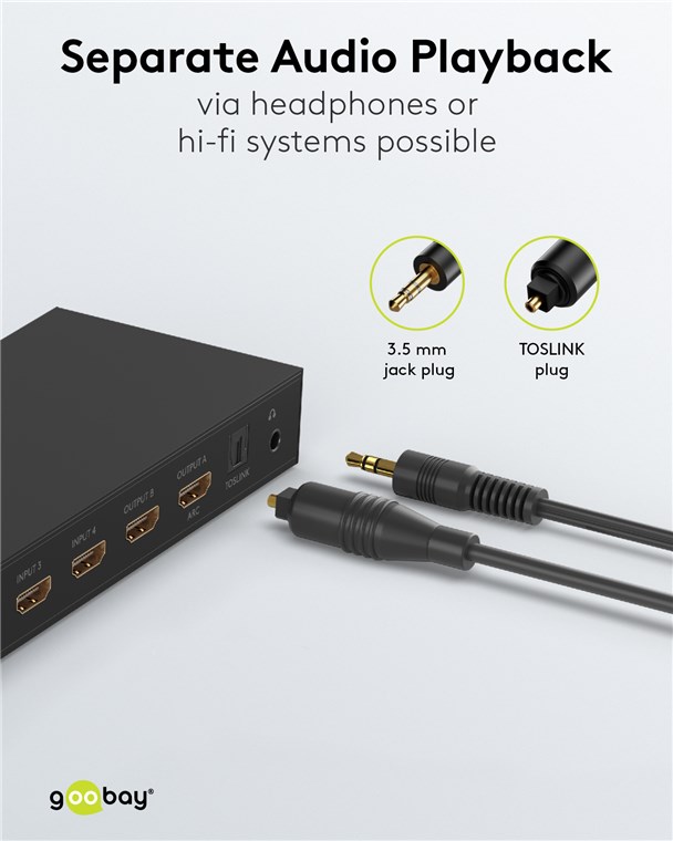 • Matrix verbindet 4x HDMI™-Quellen mit 2x HDMI™-Displays und ermöglicht eine separate Audiowiedergabe über den S/PDIF-Ausgang oder die 3,5-mm-Klinke