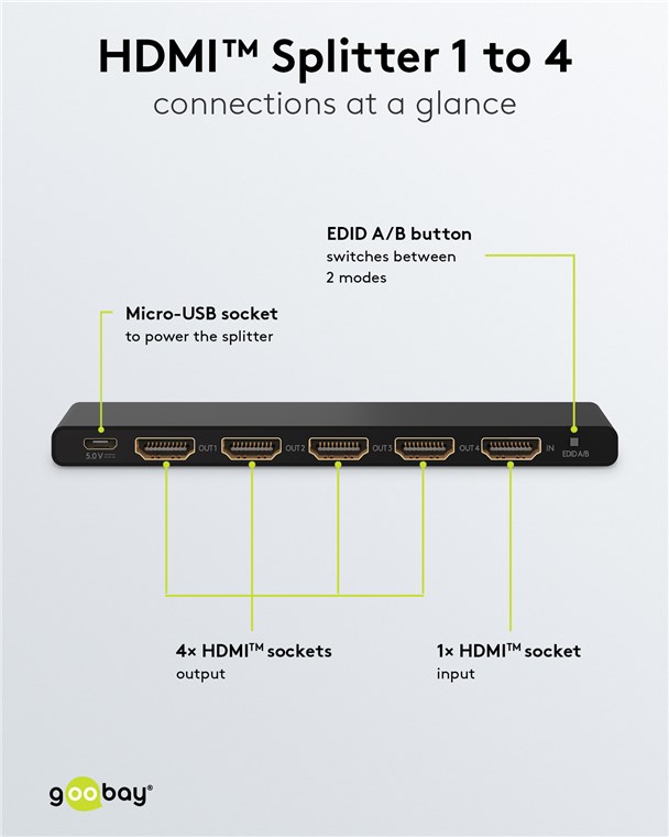 Weiterführende Links zu "Goobay 58483 HDMI™-Splitter 1 auf 4 VPE Bulk Mindestbestellmenge 1"