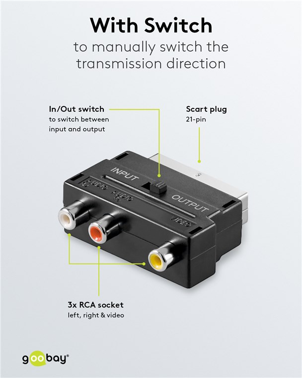 • Goobay-SCART-Adapter zur Verbindung von Geräten mit Composite-Video- oder S-Video-/S-VHS-Anschluss an Geräte mit SCART-Anschluss