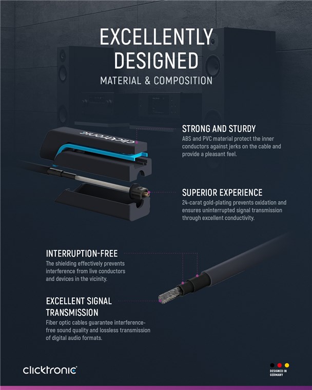 Clicktronic legt größten Wert auf Langlebigkeit und Stabilität. Unser Qualitätsversprechen: 10 Jahre Garantie auf unsere Toslink-Kabel. Die markeneigene Konstruktion unserer Verbindungskabel macht sie äußerst robust. Der dreiteilige Steckeraufbau aus PVC- und ABS-Komponenten kompensiert ein ruckartiges Ziehen am Kabel, wodurch es ideal vor Kabelbrüchen geschützt ist. Hochwertige, vergoldete Kontakte und Polymer-Lichtwellenleiter übertragen digitale und optische Audio-Signale in maximaler Soundqualität für ein perfektes Klang-Erlebnis. Die markeneigene, robuste Konstruktion unserer Audiokabel sorgt somit für dauerhaftes Home-Entertainment.