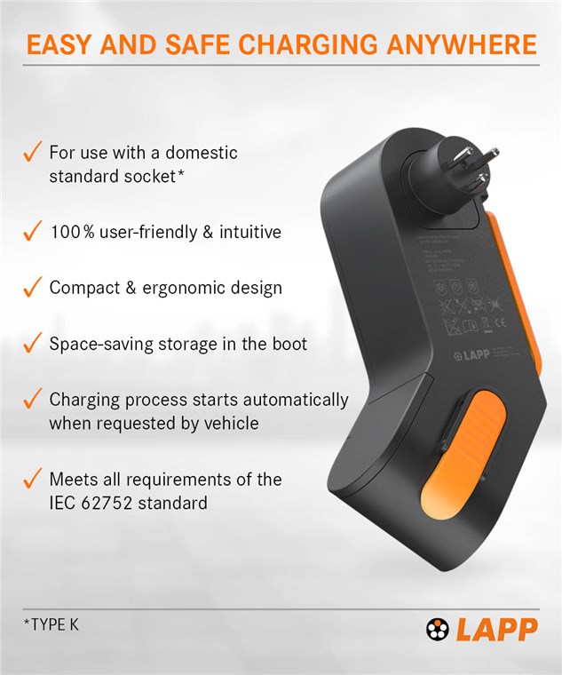 • LAPP Ladegerät ermöglicht einfaches, mobiles Laden über haushaltsübliche dänische Steckdosen (Stecker-Typ K) und ist ideal unterwegs oder auch in der heimischen Garage