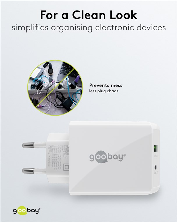 • Aufgrund des Eingangsspannungsbereichs von 100-240 V ist das Goobay-USB-C™ Netzteil auch im Ausland einsetzbar.