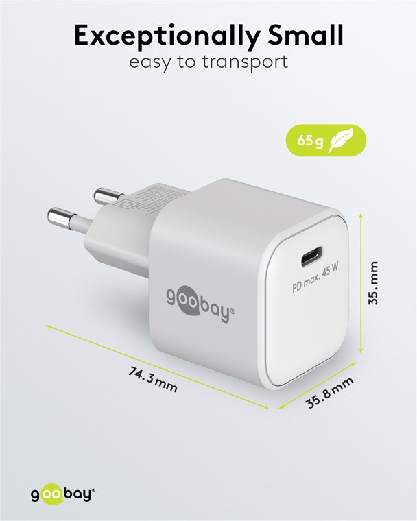 Goobay 65332 USB-C™ PD GaN Schnellladegerät Nano (45 W) weiß VPE Retail Polybag Mindestbestellmenge 1