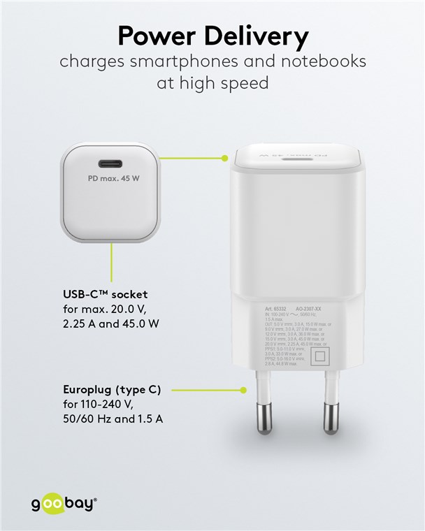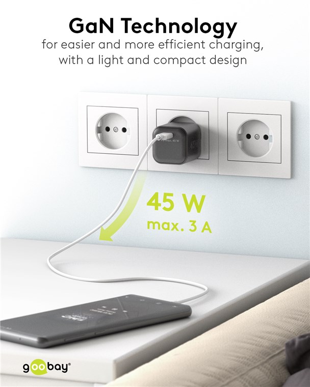 • Mit der starken Leistung von 45 W und dem universellen USB-C™-Anschluss ist das Goobay-Netzteil für so gut wie jedes Gerät geeignet - vom Smartphone bis hin zum Notebook