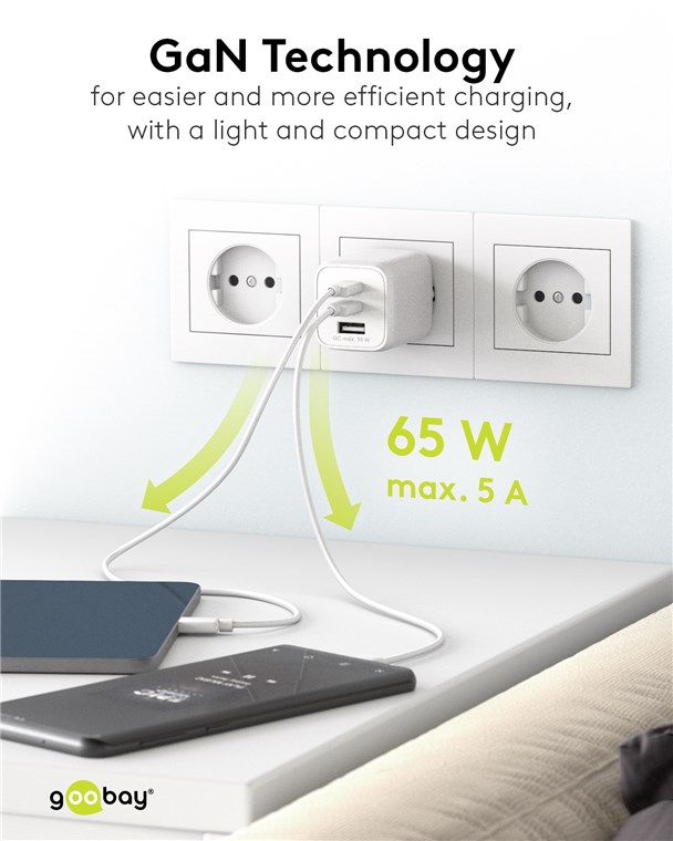 Produktinformationen "Goobay 64754 USB-C™ PD GaN Multiport-Schnellladegerät Nano (65 W) weiß Farbversion: weiß VPE Retail Polybag Mindestbestellmenge 1"