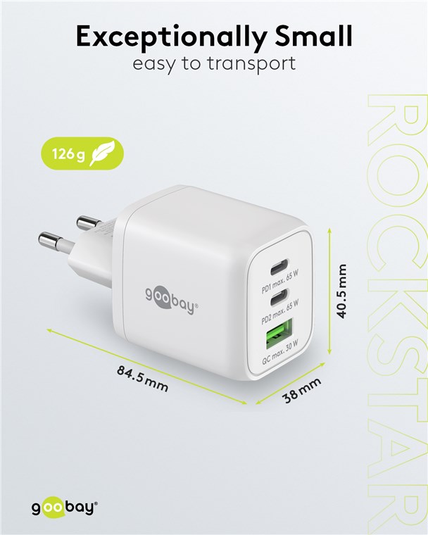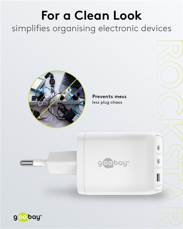 Ein superkompaktes Design, eine starke Leistung, hohe Energieeffizienz und flexible Anschlüsse - vereint in einem einzigen Ladegerät. Das Goobay-Netzteil ist die perfekte Stromversorgung zu Hause und unterwegs und lädt zuverlässig und schnell jedes Gerät, vom Bluetooth-Kopfhörer bis zum Laptop. Einfach. Alles. Passend!