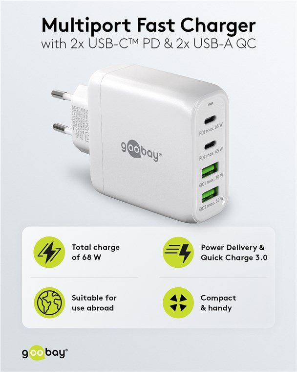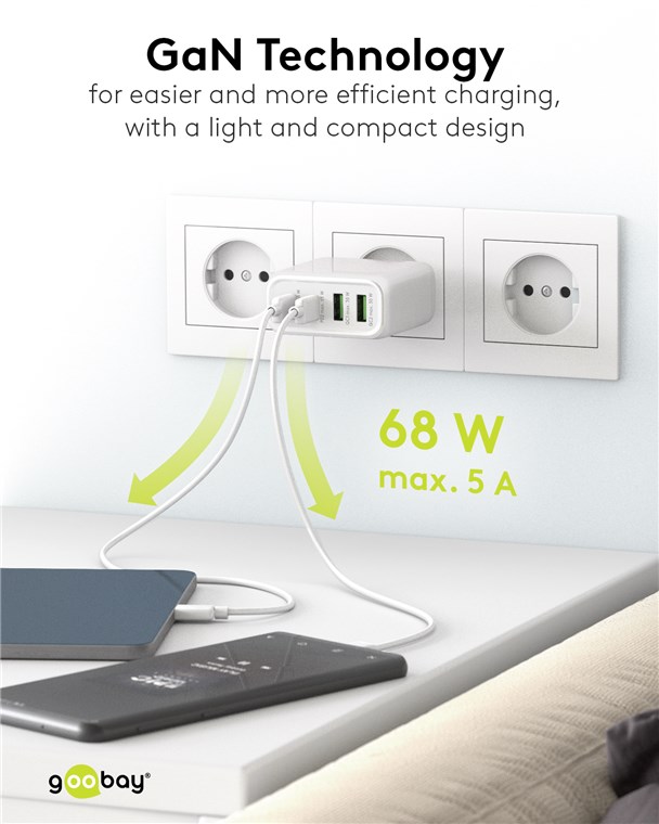 Produktinformationen "Goobay 64818 USB-C™ PD GaN Multiport-Schnellladegerät (68 W) weiß Farbversion: weiß VPE Retail Polybag Mindestbestellmenge 1"