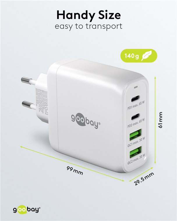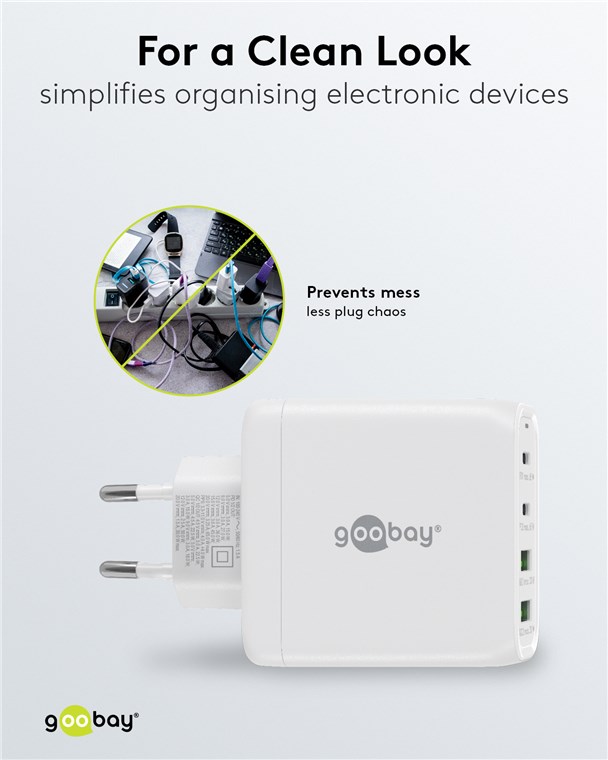 Flexible Anschlüsse, eine starke Leistung, hohe Energieeffizienz und ein kompaktes Design - vereint in einem einzigen Ladegerät. Das Goobay-Netzteil ist die perfekte Stromversorgung zu Hause und unterwegs und lädt zuverlässig und schnell jedes Gerät, vom Bluetooth-Kopfhörer bis zum Laptop. Einfach. Alles. Passend!