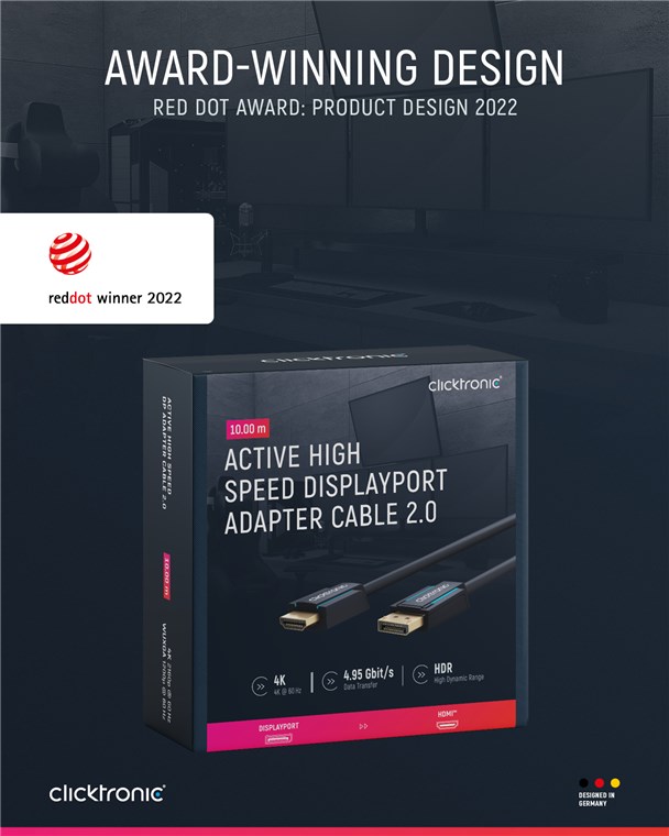 Clicktronic legt größten Wert auf Langlebigkeit und Stabilität. Unser Qualitätsversprechen: 10 Jahre Garantie auf unsere DisplayPort™-Kabel. Die markeneigene Konstruktion unserer Verbindungskabel macht sie äußerst robust. Der dreiteilige Steckeraufbau aus PVC- und ABS-Komponenten kompensiert ein ruckartiges Ziehen am Kabel, wodurch es ideal vor Kabelbrüchen geschützt ist. Hochwertige, vergoldete Kontakte und reine Kupferleiter übertragen Audio- und Video-Signale in maximaler Qualität für ein perfektes Heimkino- und Gaming-Erlebnis. Das Clicktronic-DisplayPort™-Kabel ermöglicht ein gestochen scharfes Bild und besitzt eine sehr schnelle Übertragungsgeschwindigkeit.