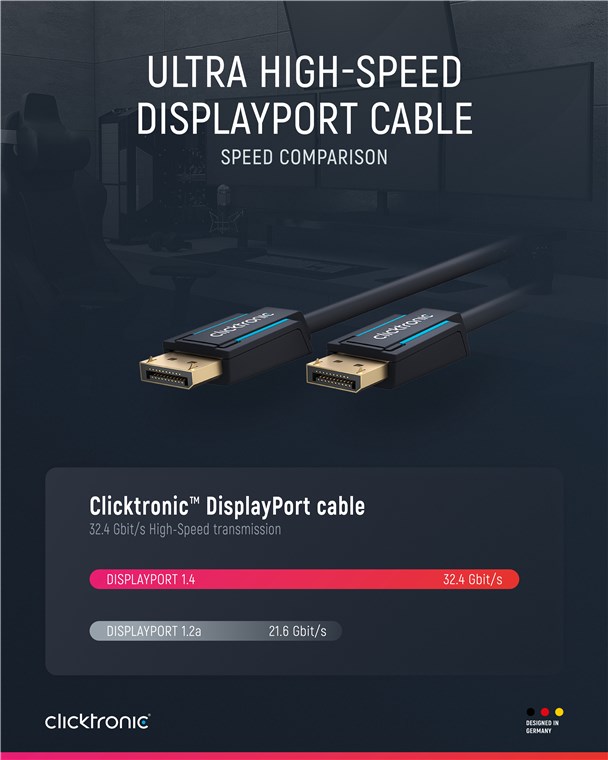 Clicktronic legt größten Wert auf Langlebigkeit und Stabilität. Unser Qualitätsversprechen: 10 Jahre Garantie auf unsere DisplayPort™-Kabel. Die markeneigene Konstruktion unserer Verbindungskabel macht sie äußerst robust. Der dreiteilige Steckeraufbau aus PVC- und ABS-Komponenten kompensiert ein ruckartiges Ziehen am Kabel, wodurch es ideal vor Kabelbrüchen geschützt ist. Hochwertige, vergoldete Kontakte und reine Kupferleiter übertragen Audio- und Video-Signale in maximaler Qualität für ein perfektes Heimkino- und Gaming-Erlebnis. Das Clicktronic-DisplayPort™-Kabel ermöglicht ein gestochen scharfes Bild und besitzt eine sehr schnelle Übertragungsgeschwindigkeit.