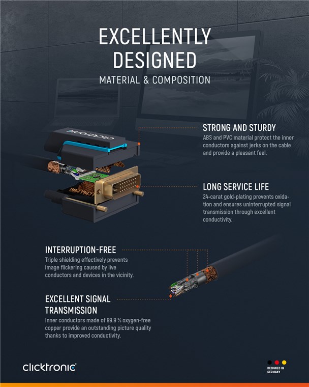 Clicktronic legt größten Wert auf Langlebigkeit und Stabilität. Unser Qualitätsversprechen: 10 Jahre Garantie auf unsere HDMI™-Kabel. Die markeneigene Konstruktion unserer Verbindungskabel macht sie äußerst robust. Der dreiteilige Steckeraufbau aus PVC- und ABS-Komponenten kompensiert ein ruckartiges Ziehen am Kabel, wodurch es ideal vor Kabelbrüchen geschützt ist. Hochwertige, vergoldete Kontakte und reine Kupferleiter übertragen digitale Signale in maximaler Qualität. Durch die schraubbare Befestigung am DVI-D-Stecker ist auch bei beweglichen Monitoren sicherer Halt und eine optimale Übertragung gewährleistet. Das DVI-D-auf-HDMI™-Adapterkabel ermöglicht ein gestochen scharfes Bild und besitzt eine schnelle Übertragungsgeschwindigkeit.