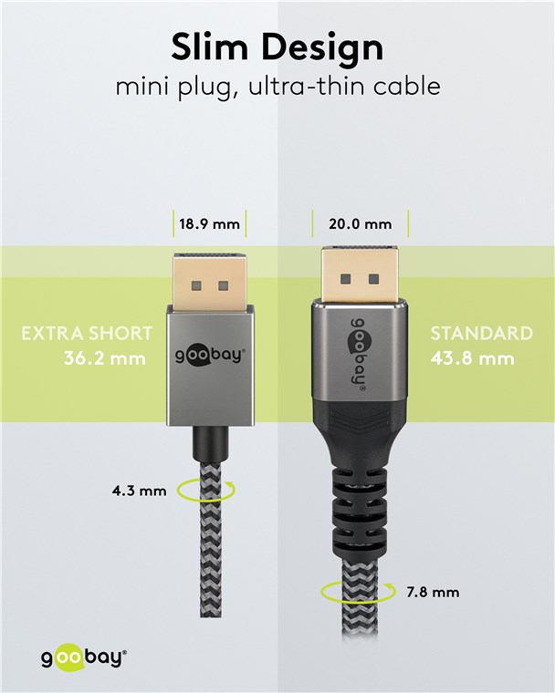 Die Goobay Plus Serie im edlen Metalldesign in Sharkskin Grey überzeugt dreifach: Ultraslim-Kabel, ultrakurze Stecker und ultraschmaler Biegeradius. Diese drei Faktoren machen das Kabel perfekt für die Installation auf Geräterückseiten und überall, wo nur wenig Raum verfügbar ist. Mit ultrahoher 8K-Bildauflösung für gestochen scharfe Bilder und hochfrequenter Multimonitor-Funktion ist das DisplayPort™-Kabel die perfekte Wahl für immersives Gaming und fesselnde Home-Entertainment-Erlebnisse.