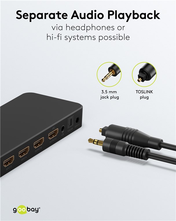 • TOSLINK- und 3,5-mm-Klinkenbuchse ermöglichen die separate Audiowiedergabe über z. B. Hi-Fi-Anlage, Soundbar oder Kopfhörer