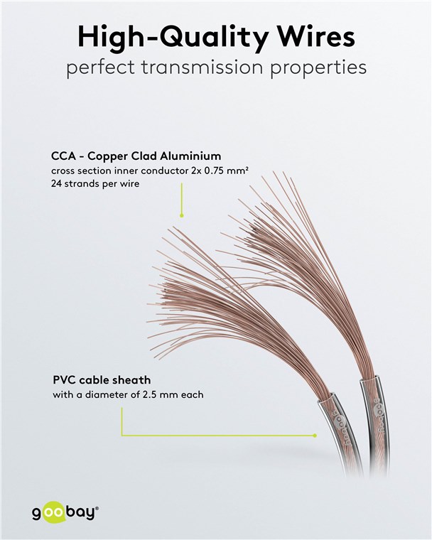 • Lautsprecherkabel mit hochwertiger Litze (CCA: Copper Clad Aluminium) für gute Übertragungseigenschaften z. B. zwischen Hi-Fi-Anlage und Lautsprecher