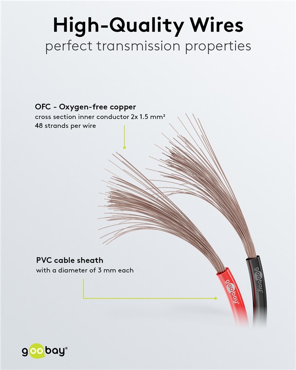 • Als Meterware geliefert, kann das Goobay-Hi-Fi-Lautsprecherkabel für den jeweiligen Einsatz selbst konfektioniert werden.