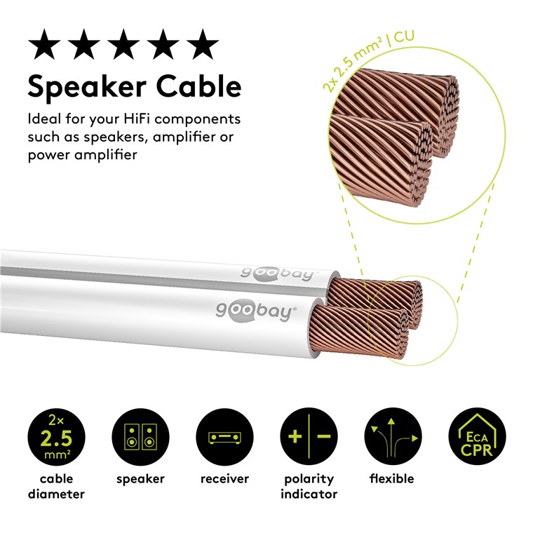 • Als Meterware geliefert, kann das Goobay-Hi-Fi-Lautsprecherkabel für den jeweiligen Einsatz selbst konfektioniert werden.