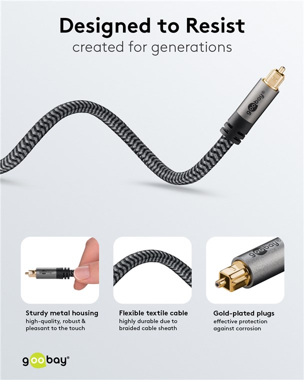 Die Goobay Plus Serie im schlanken, edlen Metalldesign in Sharkskin Grey. Das optische TOSLINK-Kabel sorgt für die superschnelle Übertragung von Audiosignalen völlig ohne Störeinflüsse - für eine absolut synchrone Wiedergabe von Ton und Bild über Heimkinosysteme.