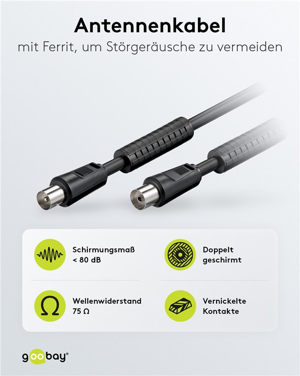 Weiterführende Links zu "Goobay 50743 Antennenkabel mit Ferrit (80 dB), doppelt geschirmt VPE Bulk Mindestbestellmenge 1"