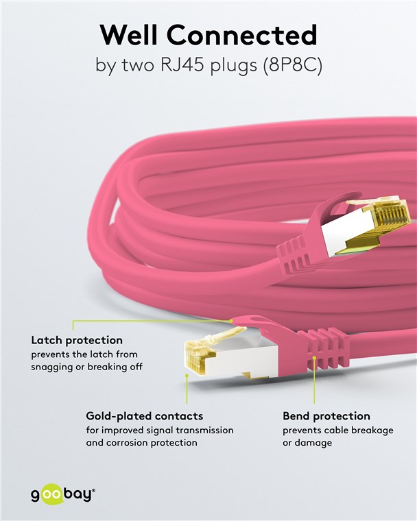 Weiterführende Links zu "Goobay 91596 RJ45 Patchkabel CAT 6A S/FTP (PiMF), 500 MHz mit CAT 7 Rohkabel, magenta VPE Cable Tag Mindestbestellmenge 1"