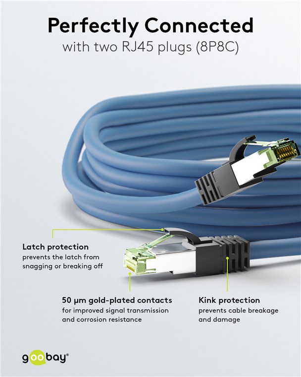 Unsere CAT-Kabel übertragen Signale in maximaler Qualität bei extremer Geschwindigkeit und sorgen für eine stabile Verbindung. Hochwertige Innenleiter, robuste Kabelummantelung und passgenaue Stecker zeichnen unsere Verbindungskabel und Stecker aus. Sie sind speziell für eine hochauflösende Bildübertragung in 8K @ 60 Hz und 4K @ 120 Hz geeignet. Goobay hat immer das richtige Produkt für Ihre Netzwerkanwendung - sowohl für das Heim- als auch das Firmennetzwerk. Einfach. Alles. Passend!