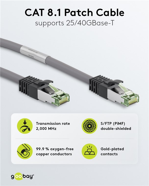 Goobay 61117 GHMT-zertifiziertes CAT 8.1 Patchkabel, S/FTP (PiMF), grau VPE Cable Tag Mindestbestellmenge 1