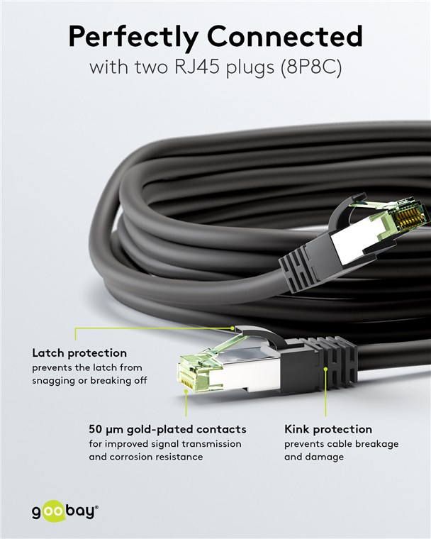 Unsere CAT-Kabel übertragen Signale in maximaler Qualität bei extremer Geschwindigkeit und sorgen für eine stabile Verbindung. Hochwertige Innenleiter, robuste Kabelummantelung und passgenaue Stecker zeichnen unsere Verbindungskabel und Stecker aus. Sie sind speziell für eine hochauflösende Bildübertragung in 8K @ 60 Hz und 4K @ 120 Hz geeignet. Goobay hat immer das richtige Produkt für Ihre Netzwerkanwendung - sowohl für das Heim- als auch das Firmennetzwerk. Einfach. Alles. Passend!