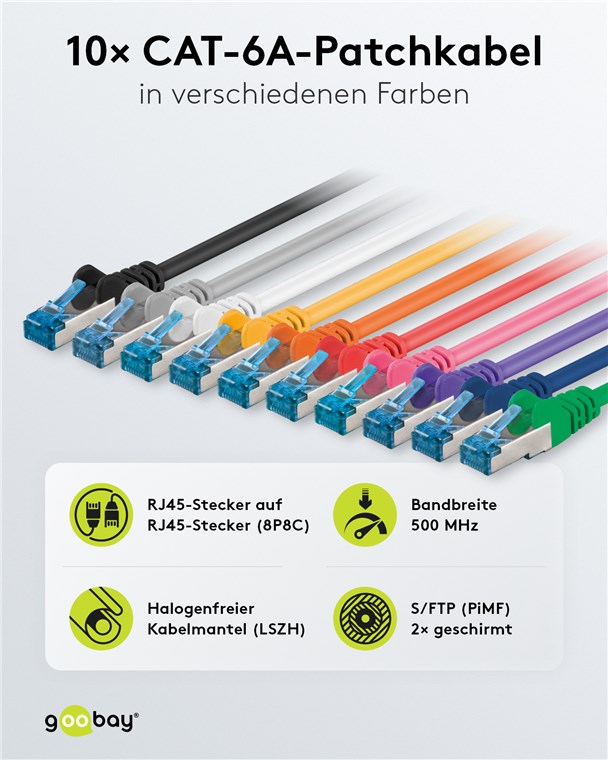 Weiterführende Links zu "Goobay 69858 CAT 6A Patchkabel, S/FTP (PiMF), 5 m, Set in 10 Farben VPE Bulk Mindestbestellmenge 1"