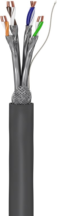 • S/FTP-Gesamtschirmung: Aluminium-Folienschirmung für einzelne Adernpaare (PiMF) und Aluminium-Geflechtschirmung für den Kabelmantel