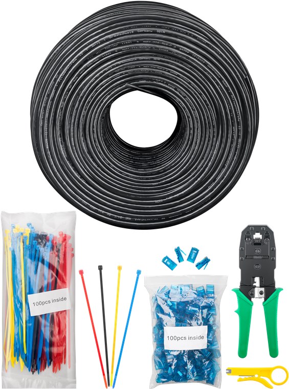 • Internetkabel-Set bestehend aus 1x CAT-6-LAN-Kabel, 1x Crimpzange, 100x farbigen Kabelbindern und 100x RJ45-Steckern.