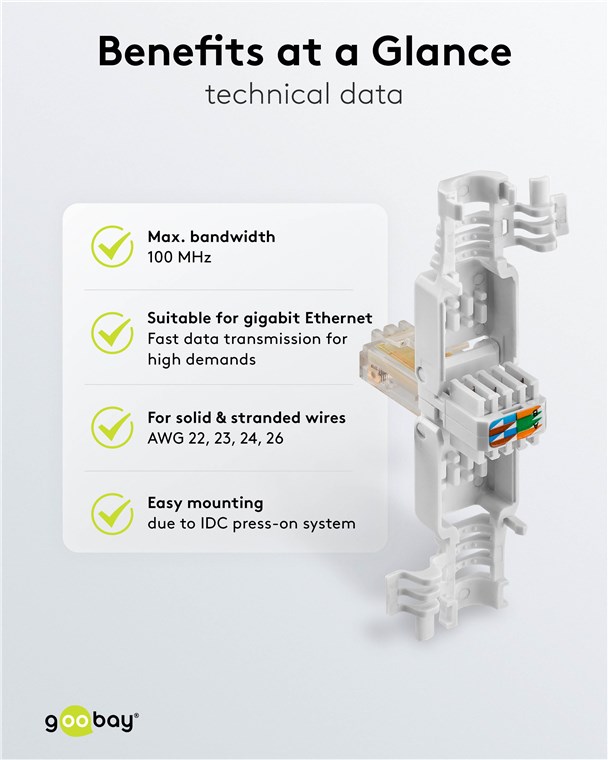 Unser Netzwerk-Zubehör überträgt Signale in maximaler Qualität und Schnelligkeit. Hochwertige Materialien, robuste Gehäuse und passgenaue Kontakte zeichnen unsere Buchsen, Stecker und Kupplungen aus. Goobay hat immer das richtige Produkt für den Aufbau einer stabilen Internetverbindung - sowohl für das Heim- als auch das Firmennetzwerk. Einfach. Alles. Passend!