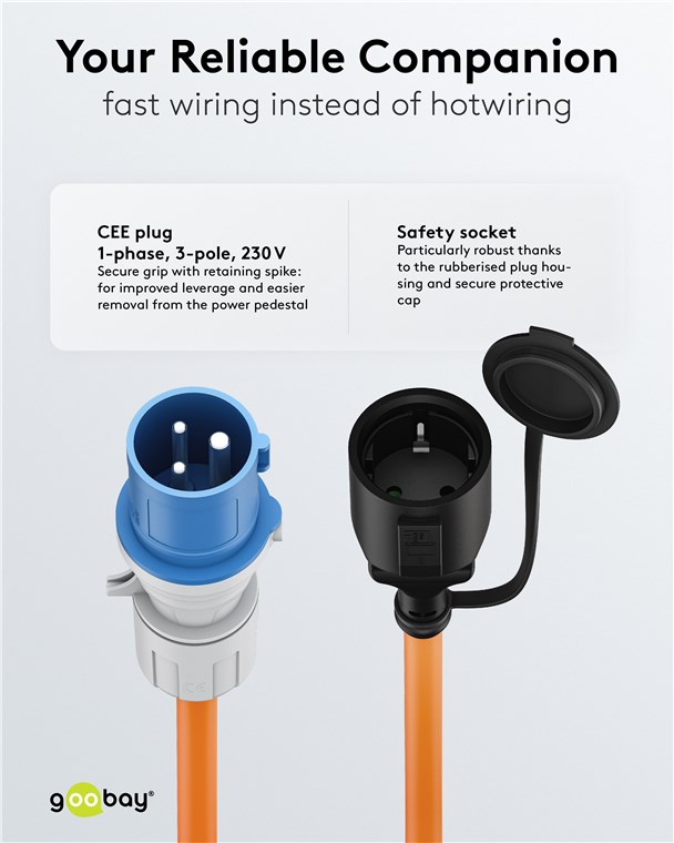 • Die orange Signalfarbe des Stromkabels sorgt für erhöhte Sichtbarkeit und erfüllt die Sicherheitsstandards auf internationalen Campingplätzen