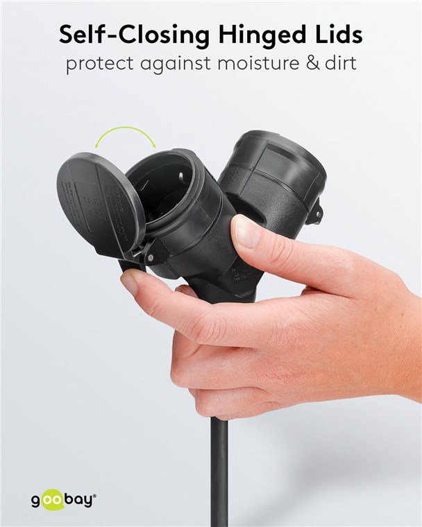 • Selbstschließende Klappdeckel vor den Buchsen sorgen für besonderen Schutz der Verteilersteckdose vor Schmutz und Feuchtigkeit