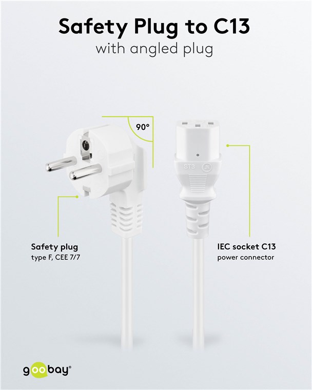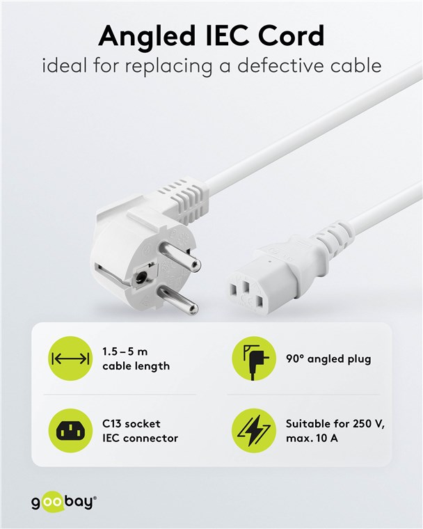 Weiterführende Links zu "Goobay 95140 Abgewinkeltes Kaltgeräte-Anschlusskabel, 2 m, Weiß, (3*0,75 mm²) VPE Retail Polybag Mindestbestellmenge 1"