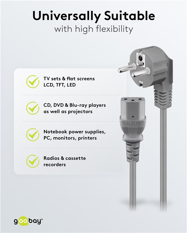 • Netzkabel geeignet für Kaltgeräte wie z. B. PC, Monitor, Beamer u.v.m.