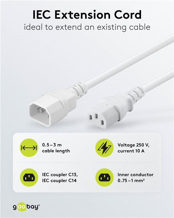Weiterführende Links zu "Goobay 97581 Kaltgeräte Verlängerungkabel, 0,5 m, Weiß, (3*0,75 mm²) VPE Retail Polybag Mindestbestellmenge 1"
