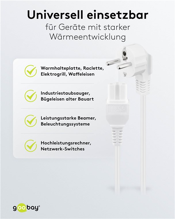 • Netzkabel geeignet für z. B. Warmhalteplatten, Tischgrill, Bügeleisen, Waffeleisen und andere Geräte mit einem Warmgeräteanschluss (C16)