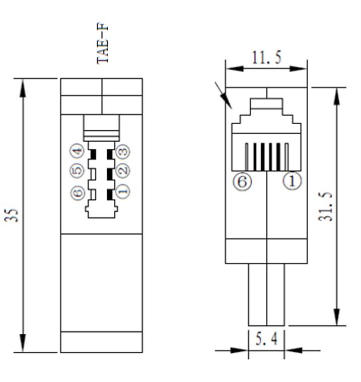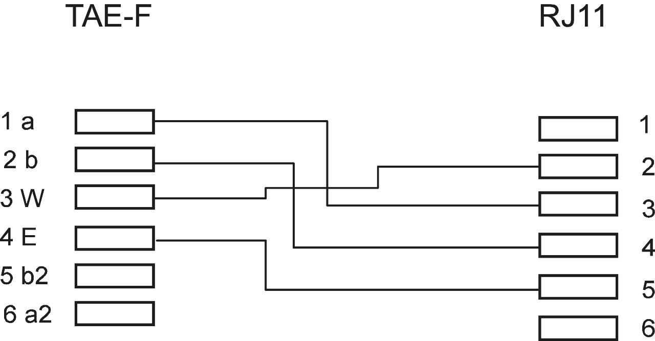 • TAE Telefonadapter ermöglicht die Verbindung zwischen einem Telefonkabel mit RJ11-Stecker und einer Telefondose