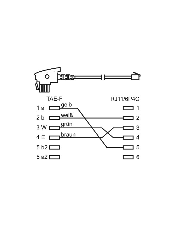 • Genormte Modularstecker (TAE-F-Stecker zu RJ11-Stecker) mit 4-adriger Belegung: 1(a) - 5, 2(b) - 2, 3(W) - 4, 4(E) - 3