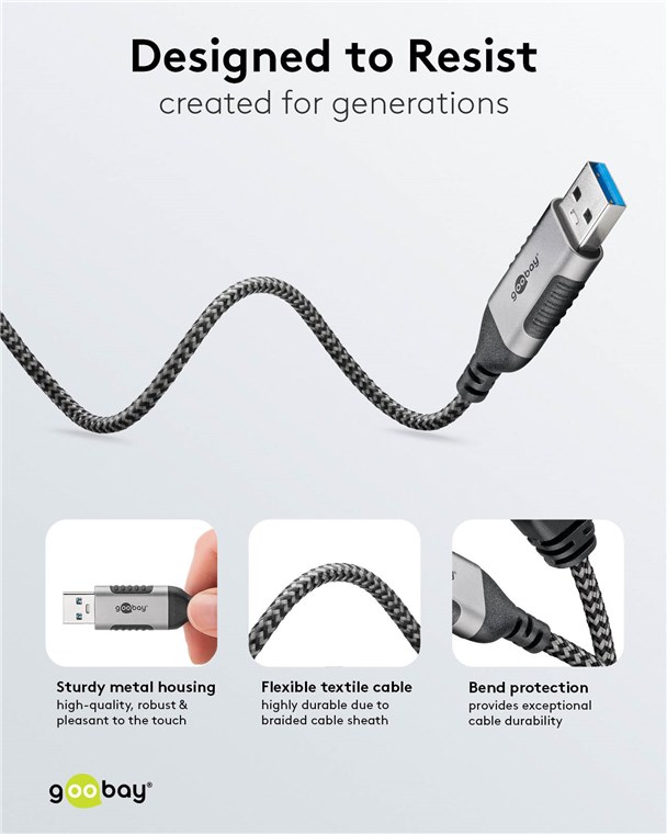 • Der geflochtene, strapazierfähige Textilmantel des USB-Kabels hat eine angenehme Haptik und ist schonend auf sensiblen Oberflächen