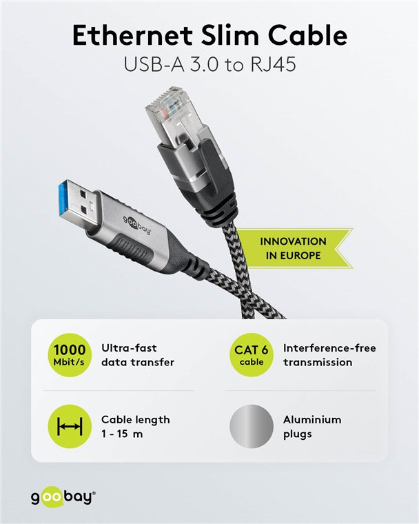 Goobay 74394 Ethernet-Kabel USB-A 3.0 auf RJ45, Slim, 1,5 m VPE Retail Polybag Mindestbestellmenge 1