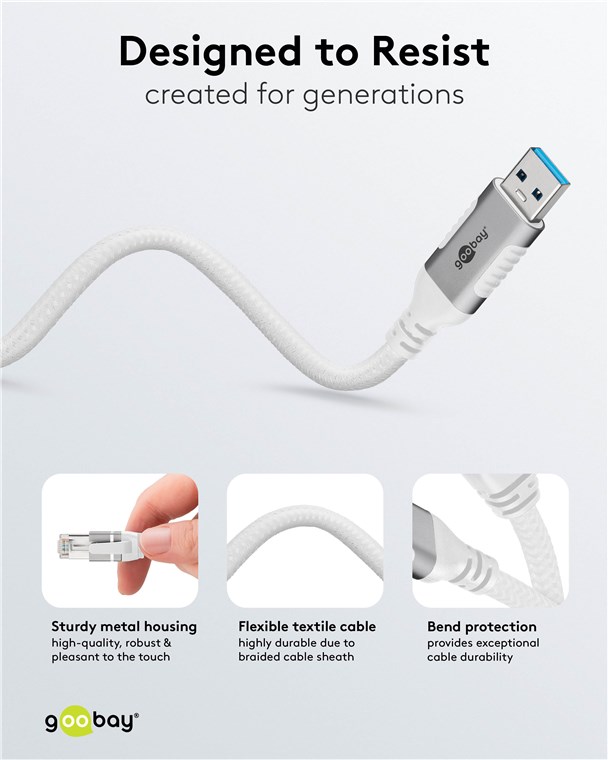 • Der geflochtene, strapazierfähige Textilmantel des USB-Kabels hat eine angenehme Haptik und ist schonend auf sensiblen Oberflächen
