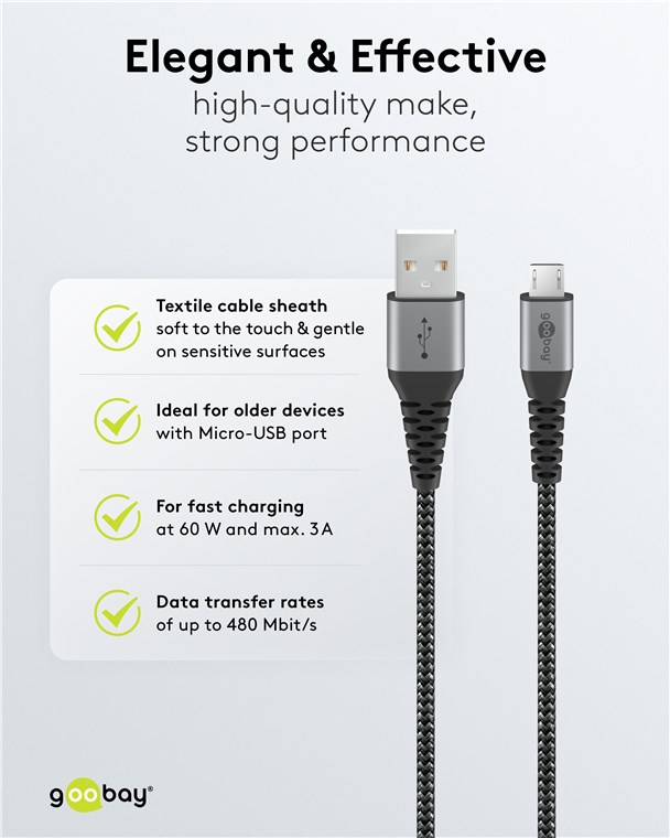 Produktinformationen "Goobay 49282 Micro-USB-auf-USB-A-Textilkabel mit Metallsteckern (spacegrau/silber), 1 m VPE Retail Polybag Mindestbestellmenge 1"
