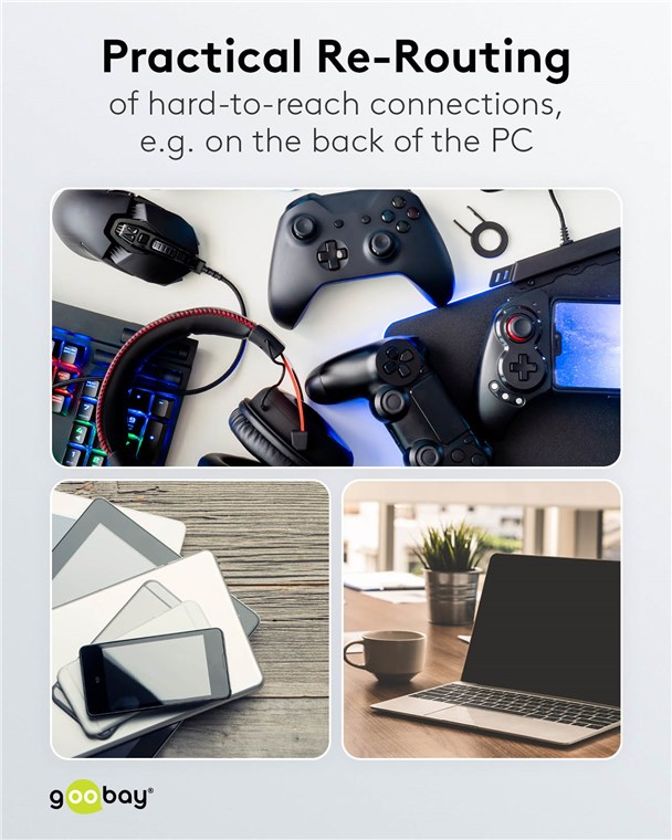 • USB-Ports lassen sich so komfortabel auf den Schreibtisch, ein Computergehäuse oder den Fernsehtisch verlegen