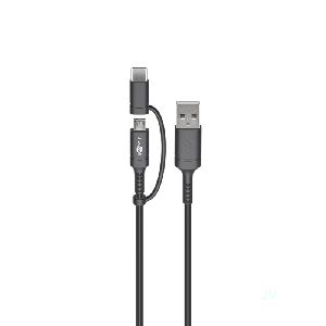 Lade- und Synchronisations-Kombikabel für Geräte mit Micro-USB- und/oder USB-C™-Anschluss. Das Datenkabel besitzt einen Hi-Speed USB-A 2.0-Stecker mit einer Datenübertragung von bis zu 480 Mbit/s und unterstützt einen Ausgangsstrom von bis zu 2100 mAh.