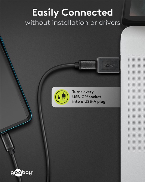 • USB-Adapter zum Anschluss eines USB-C™-Kabels an eine USB-A-Buchse, z. B. an Laptop, PC oder Smartphone